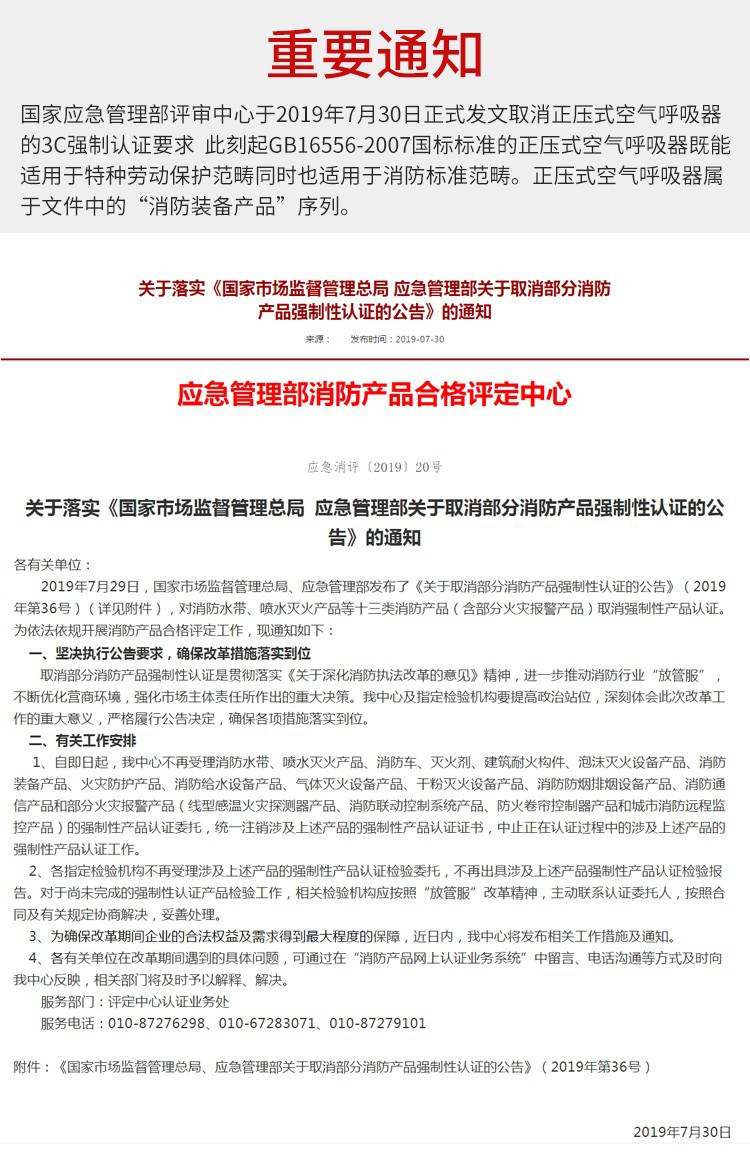 國家應急管理部評審中心于2019年7月30日正式發(fā)文取消正壓式空氣呼吸器等消防員裝備3C強制認證要求,此刻起GB16556-2007國標標準的正壓式空氣呼吸器既能適用于特種勞動防護用品范疇同時也適用于消防標準范疇。正壓式空氣呼吸器屬于文件中的CNCA-C18-04-2014“消防裝備產(chǎn)品”序列。