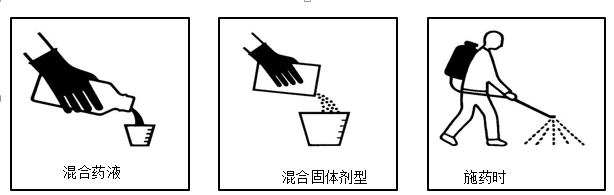 每種產品標簽都會說明在測量/混配和施藥時需要的防護裝備,這些信息會以象形圖來展示為了幫助所有產品使用者可以完全理解,在以下圖示操作時的防護要求。