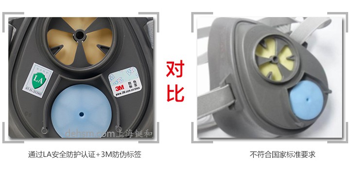 3、正品3M3200防毒面具通過LA安全認證,同時面罩本體上貼有3M獨有的防偽標簽;而假冒產品沒有任何標簽或者貼的高仿標簽。