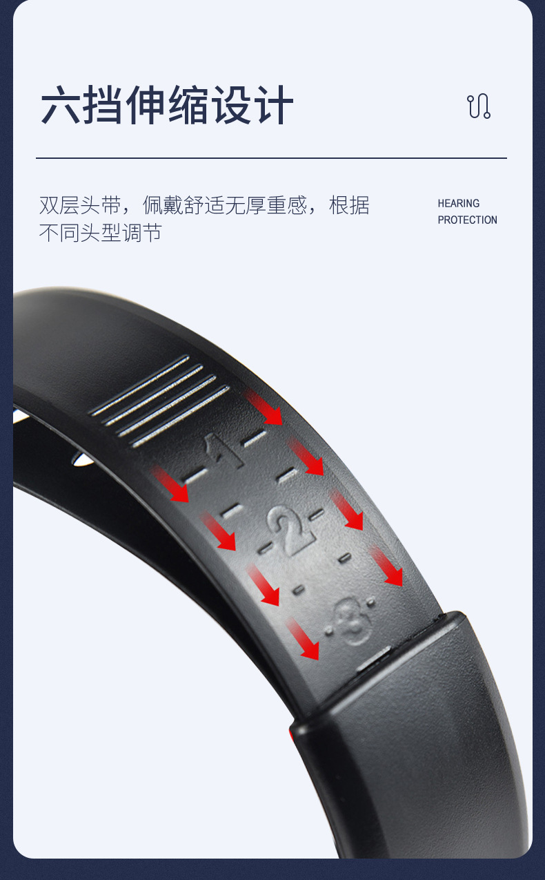 華特7302防噪音耳罩軟墊內(nèi)采用降噪海綿填充外部采用仿皮包邊柔和緊貼耳邊減少壓迫感;六擋伸縮設(shè)計雙層頭帶,佩戴舒適無厚重感,根據(jù)不同頭型調(diào)節(jié)。