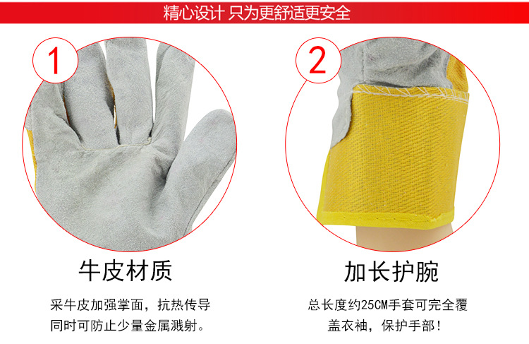 華特1#半皮全掌電焊手套采用牛皮加強(qiáng)掌面,抗熱傳導(dǎo)同時(shí)可防少量金屬濺射。優(yōu)質(zhì)牛皮縫線手套,掌面、拇指和食指均有加強(qiáng)保護(hù)。加長護(hù)腕投計(jì),可覆蓋衣袖防護(hù)手部。滌棉耐磨襯里,舒適柔軟,防滑吸汗效果好。