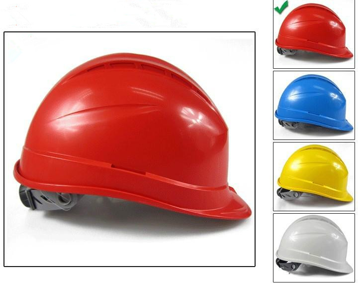 抗紫外線高密度聚丙烯安全帽。下壓棘輪式可調節。排汗帶。尺寸:53-63cm