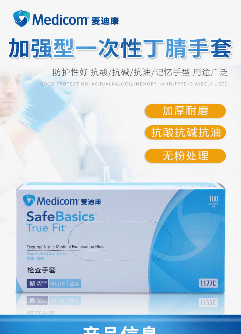麥迪康1177一次性丁腈手套(加強型)彈力拉伸,緊貼肌膚,符合人體工學設計,佩戴時更加舒適;