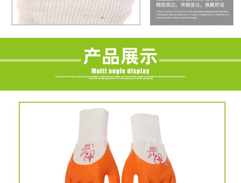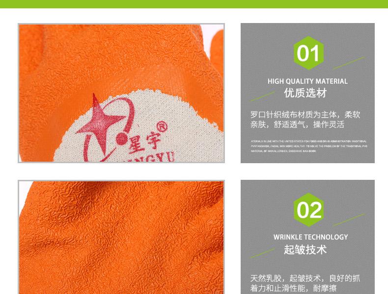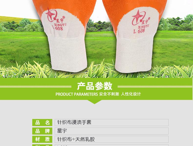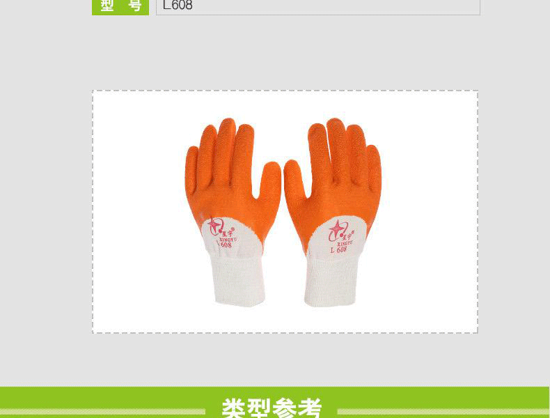 星宇L608乳膠皺紋半浸勞保手套針織布,天然乳膠。輕巧靈敏,柔軟舒適,良好的耐磨損性能;拇指全浸,充分保護虎口,更加安全防護;彈性手脖,精致鎖邊,伸展度佳,佩戴舒適。